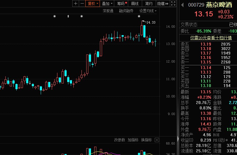 燕京啤酒的股价今日尾盘有所拉升,最终收涨0.23%。