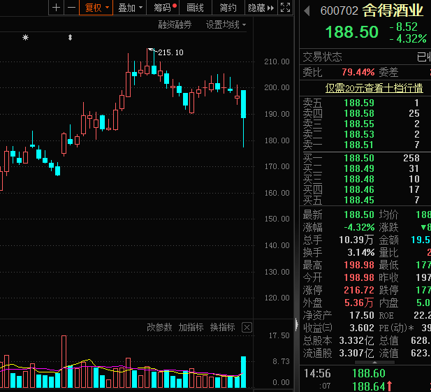 舍得酒业盘中一度触及跌停