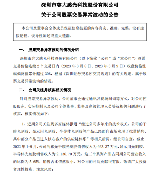 值得注意的是,在大涨之后,9日晚间,多家上市公司公告或者在互动平台回应提示公司光刻胶业务相关情况。