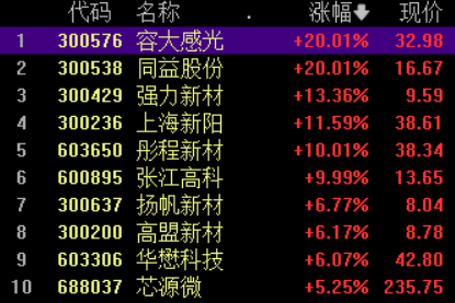 3月9日,光刻胶概念表现抢眼,截至收盘,整个板块涨幅超4%,容大感光二连板,同益股份、彤程新材、张江高科等涨停,强力新材、上海新阳等涨超10%。