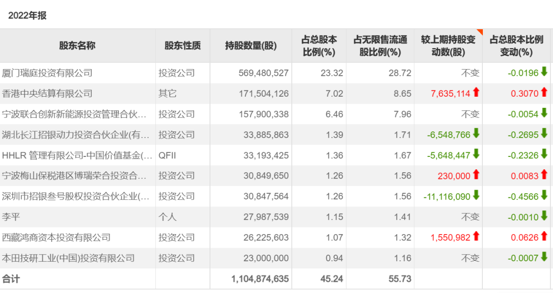 从十大流通股东变动情况来看,去年第四季度,宁德时代的股东增减仓方向不一。其中,高瓴资本(HHLR 管理有限公司)减持564.84万股,截至2022年12月31日,该QFII席位仍是宁德时代第五大流通股股东。