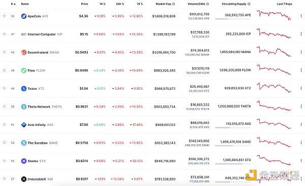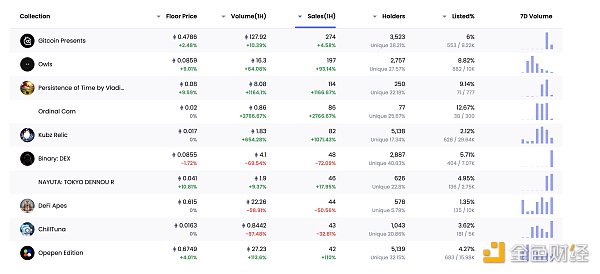 24小时NFT交易量、交易量前十项目 数据来源:Coinmarketcap