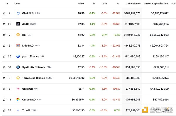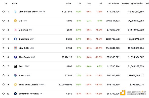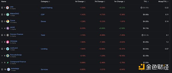 DeFi项目锁定资产前十排名及锁仓量 数据来源:defillama