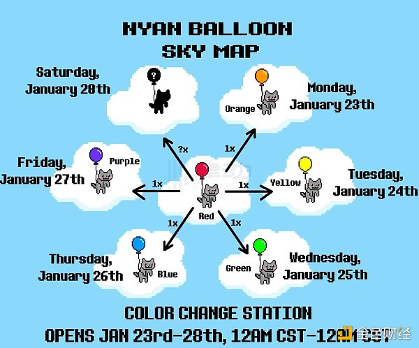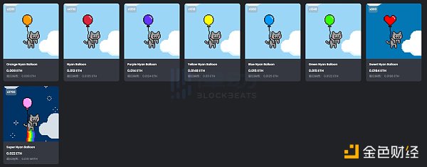 今年 1 月份的「Nyan Balloon」就是用 Manifold 完成了从发售到 Burn-Redeem 的一系列工作。该系列由彩虹猫「Nyan Cat」作者 Chris Torres 以 Open Edition 的形式在 Manifold 上推出,以 0.0077 ETH 的价格在 7 小时内售出了 21191 份。发售完成后,Chris Torres 很快发布了「Nyan Balloon Sky Map」,这是一个持续 6 天的 Burn-Redeem 活动,每天都可以 Burn 原始的「Nyan Balloon」来获得有着不同颜色气球的彩虹猫。