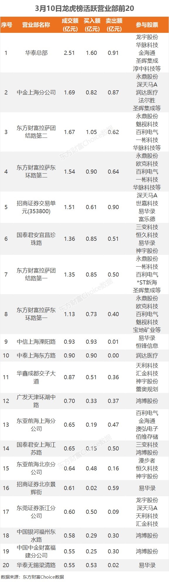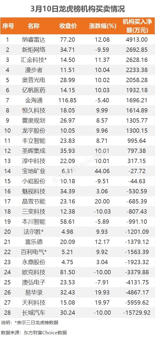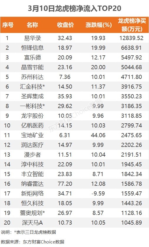 3月10日龙虎榜揭秘:1.28亿抢筹易华录 机构净买13只股