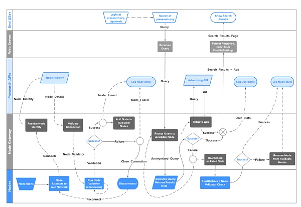 节点网关(Node Gateway):接收来自 Web 服务器的请求,删除其中的个人身份信息,并将搜索传递给一个或多个正常运行的节点。