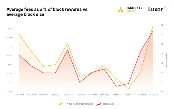 现在只有超过 1000 个序数 NFT 在流通,所以它们还不能达到让交易手续费率呈抛物线增长。也就是说,比特币交易的手续费和区块体积确实都在 1 月的最后两天显著增长,但增长的一部分原因可能是比特币的哈希率从历史最高点下降了 3% ,也就是出块的时间变长了,因此导致交易入块时间变长以及手续费变高。但没有序数 NFT 的铭文热潮的话,我们很有可能不会看到交易手续费和区块体积的增大。