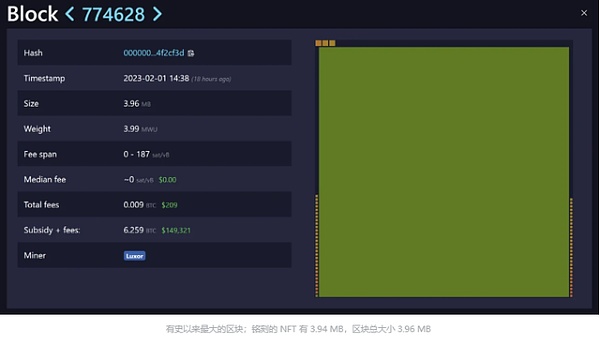 另一个关键是 Taproot 升级。虽然引入了见证数据折扣,但隔离见证依然为单笔交易可以在见证数据字段放置的数据量安排了限制。Taproot 升级放宽了这些要求,完全移除了限制,所以理论上你可以用全部的区块空间(译者注:准确来说是见证数据空间)铭刻一个内容高达 4 MB 的 NFT。(我们 Luxor 真的付诸实践了,挖出了一个带有 3.9 MB 的电子艺术品的区块,这也是有史以来最大的区块)。