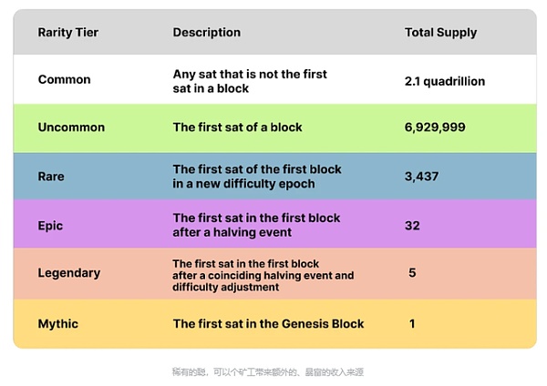 在一篇论述序数理论的博客文章中,Casey Rodarmot 列出了一份不同聪的稀有程度的图表。这个分类方法主要围绕比特币工作量证明的自我调节事件,也即难度调整事件和增发速度减半事件。例如,增发速度减半后的第一个区块中的第一个聪,会被分类为 “Epic” 聪;假设有这样的需求,这样的聪就可以在收藏家那里卖出更好的价钱。