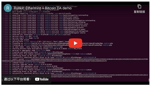 Rollkit 支持自定义执行层,包括 EVM、CosmWasm 或 Cosmos SDK。为了测试集成,Rollkit 在本地比特币测试网络上运行 EVM(使用了 Ethermint) 作为主权 Rollup。请参见下面的演示。