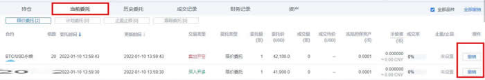 5. 下单成功后,已成交仓位显示在“当前持仓”栏,可以进行平仓、止盈止损等操作;未成交部分显示在“当前委托”栏,在成交前可以撤销委托。