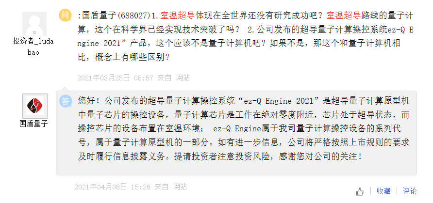 但此室温非彼室温。在2021年4月8日回复投资者提问时,国盾量子曾解释道:该公司发布的超导量子计算操控系统“ez-Q Engine 2021”是超导量子计算原型机中量子芯片的操控设备,量子计算芯片是工作在绝对零度附近,芯片处于超导状态,而操控芯片的设备布置在室温环境。