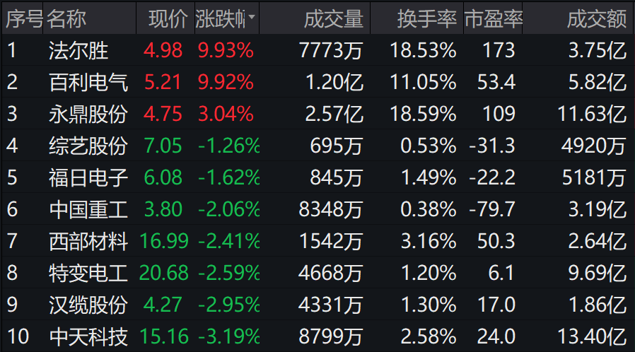 15只成分股中,法尔胜(000890)、百利电气(600468)二连板,永鼎股份(600105)涨3.04%,其余个股悉数收跌。