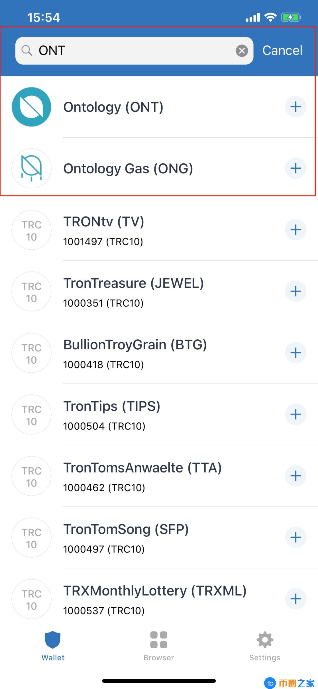 2.货币搜索“ONT”并将其添加到您的钱包中: