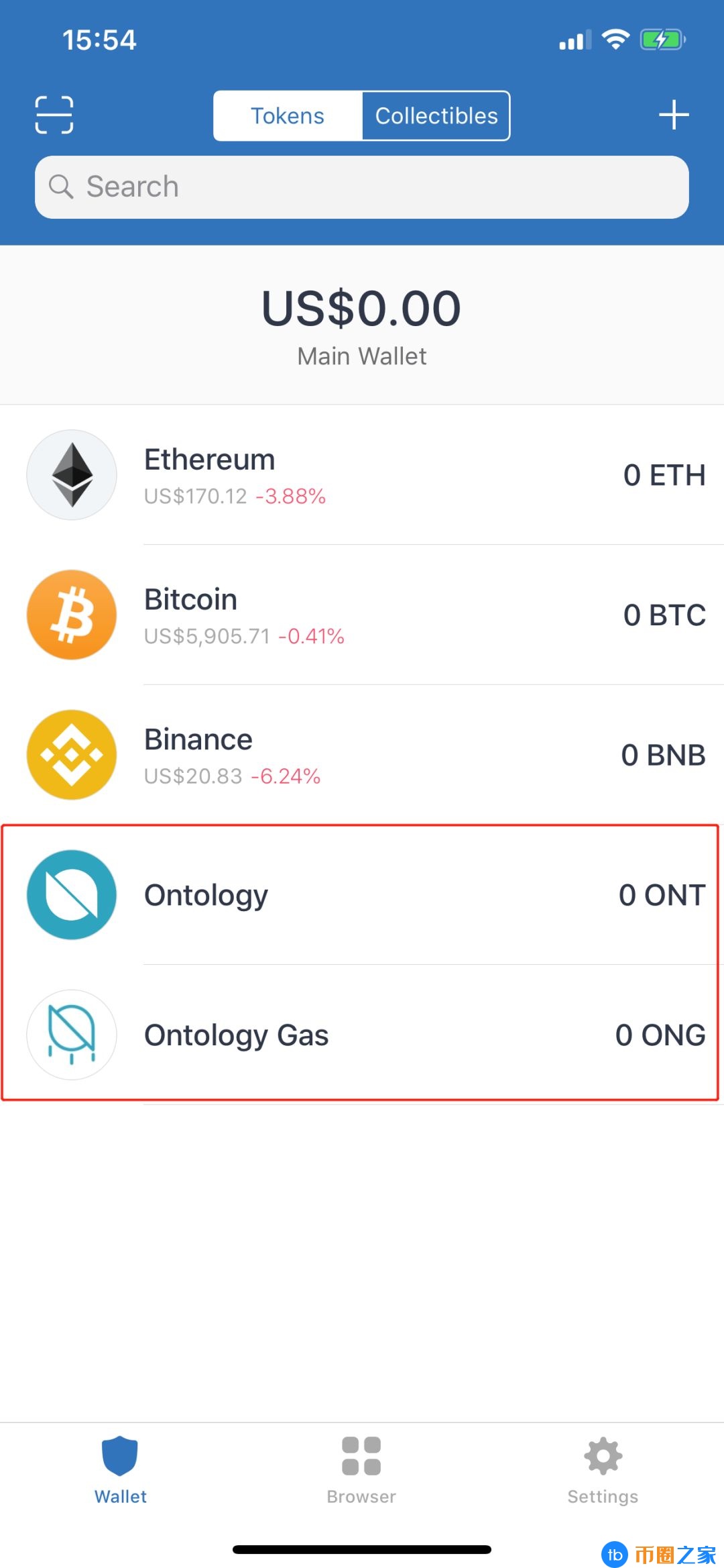 3.在货币中搜索“ONT”并将其添加到钱包中。