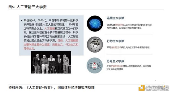 兴起:1956 年达特茅斯会议开启了人工智能的元年,仅在定理层次等证明了AI商用的可能性,实际应用还十分有限。1956 年,以约翰·麦卡锡、马文·明斯基、克劳德·香农等为代表的科学家们在达特茅斯组织了一场为期两个月的人工智能夏季研讨会,探讨如何通过机器模拟人类学习或人类智能的其他特征。本次会议结束后,很多国家政府、研究机构、军方等都开始投资人工智能,掀起了第一波人工智能热潮。在第一波 AI 的浪潮中,占据主导地位的思想是逻辑主义,即通过引入符号方法进行语义处理、将待研究和解决的问题转化为可以用计算机处理的符号,运用逻辑公理进行解答,从而实现人机互动。第一波人工智能浪潮的总体成就有限,仅在定理证明等特定领域取得了成功。受制于计算机性能及可获取的数据量,当时的人工智能只能完成玩具式的简单任务,在语音、图像识别及想起游戏等看似简单的任务上,进展都十分有限。