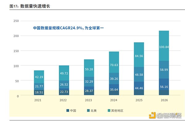 互联网及数字经济的快速发展,为 AI 算法训练提供充裕的数据来源。人工智能领域顶级专家吴恩达曾提到:发展人工智能就像用火箭发射卫星,需要强大的引擎和足够的燃料,算法模型就是其引擎,高性能的算力是打造引擎的工具,海量的数据就是引擎的燃料。基于深度学习的算法特点,其计算准确度与数据量基本成正比。例如,在输入 30 万张人类对弈棋谱并经过3000 万次自我对弈后,人工智能 AlphaGo 具备了媲美顶尖棋手的棋力。当前,机器学习所能应用的数据已经不局限于文本、数字等结构化数据,还包括视频、音频、图片等非结构化数据。而根据 IDC 的统计数据,2021 年全球数据量已经达到82 ZB,预计到2026年将达到 214 ZB。