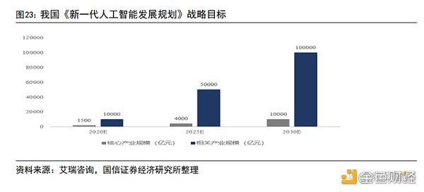 《新一代人工智能发展规划》提出了“三步走”战略目标,加速AI 再各行业渗透落地。第一步,到 2020 年,人工智能总体技术和应用与世界先进水平同步,人工智能产业成为新的重要经济增长点,核心产业规模超过1500 亿元,带动相关产业规模超过 1 万亿元;第二步,到 2025 年,新一代人工智能在智能制造、智能医疗、智慧城市、智能农业、国防建设等领域得到广泛应用,核心产业规模超过 4000 亿元,相关产业规模超过 5 万亿元;第三步,到2030 年,人工智能理论、技术与应用总体达到世界领先水平,形成涵盖核心技术、关键系统、支撑平台和智能应用的完备产业链和高端产业群,人工智能核心产业规模超过1万亿元,带动相关产业规模超过 10 万亿元。