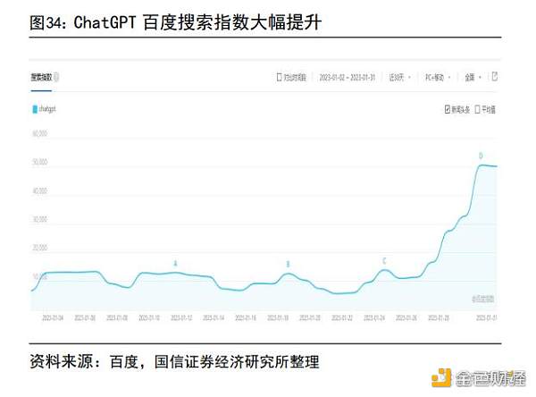 爆发与破圈阶段(2022-至今):2022 年以来,AIGC 产品密集发布,ChatGPT爆火出圈。Google 于 2022 年五月推出了文本图像生成模型lmagen,同年8月,开源 AI 绘画工具 StableDiffusion 发布;2022 年 9 月,Meta 推出可利用文字生成视频的产品 Make-A-Video 以推动其视频生态的发展。2022 年11 月30 日,OpenAl推出 AI 聊天机器人 ChatGPT,AIGC 的内容产出能力迅速吸引大批用户,至2022年 12 月 5 日,根据 OpenAI 创始人表示,ChatGPT 用户数已突破100 万。2023年2 月,微软宣布推出由 ChatGPT 支持的新版本 Bing 搜索引擎和Edge 浏览器,AIGC与传统工具进入深度融合历程。