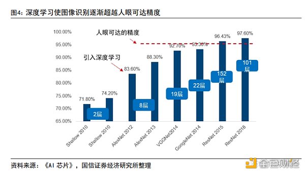 兴起: 2006 年,Hinton 提出了神经网络 DeepLearning 算法,将人类从复杂的算法归纳中解放了出来,使人工智能再一次聚焦了学术界和产业界的目光。从底层算法来讲,深度学习算法弥补了传统 BP 神经网络的缺陷:1)多隐层的人工神经网络具有优异的特征学习能力,从而有利于可视化或分类;2)传统人工神经网络的训练难度可以通过“逐层初始化”来克服。通俗来讲,本轮算法的革命性进步在于:不需要人工去提取规则特征,机器通过海量数据,即可自动实现规则的特征提取,将最复杂的“算法归纳”留给机器去完成。数据显示,自2012年在图像识别领域引入深度学习算法以来,图像识别的错误率显著降低。并通过深度学习训练层数的增长及优化,在 2015 年通过 ResNet 模型使图像识别的精度超过了人眼可达的精度。