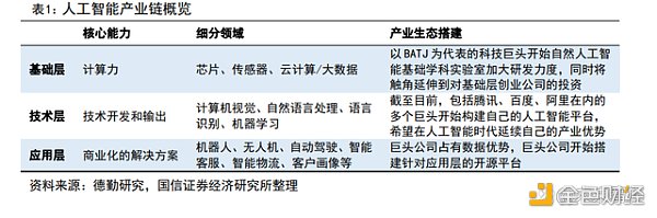 总体来看,人工智能产业链可分为基础支撑层、技术层和应用层。基础层提供算力,主要包含人工智能芯片、传感器、大数据及云计算。其中,芯片具有极高的技术门槛,且生态搭建已基本成型。目前该层级的主要布局玩家为Nvidia、AMD、英特尔等在内的国际科技巨头,国内在基础层的布局和实力均相对薄弱。技术层主要解决具体类别问题,这一层级主要依托运算平台和数据资源进行海量识别训练和机器学习建模,开发面向不同领域的应用技术,包括语音识别、自然语言处理、计算机视觉和机器学习技术等。科技巨头谷歌、IBM、亚马逊、苹果、阿里巴巴、百度都在该层级深度布局,并涌现了如商汤科技、旷世科技、科大讯飞等诸多独角兽公司。应用层主要解决场景落地问题,利用AI 技术针对行业提供产品、服务和解决方案,其核心是商业化。得益于人工智能的全球开源社区,应用层的进入门槛相对较低,但也是商业价值最大的环节(典型如算法推动在抖音、快手等应用端落地)。