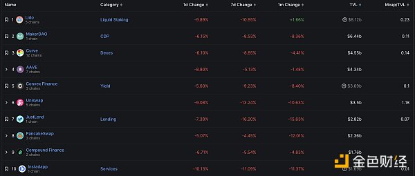 DeFi项目锁定资产前十排名及锁仓量 数据来源:defillama
