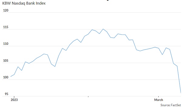 SVB蒙受巨额亏损的消息拖累整个银行板块大幅下挫,许多投资者本以为银行板块在很大程度上没有受到经济衰退担忧和利率上升的影响。SPDR S&P Bank ETF (KBE)收盘下跌7.3%,KBW Bank Index (BKX)下跌8%,创下2020年以来最大单日跌幅。