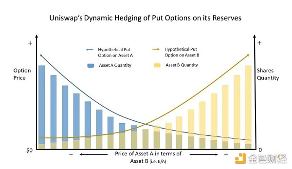 在下图中,当资产 A 的价格下跌时,Uniswap 增加对资产 A 的多头敞口,以对冲资产 A 的假定多头看跌价值中不断增加的 Delta 值。当资产 A 的价格下跌时,资产 B 的价格上升,反之亦然。