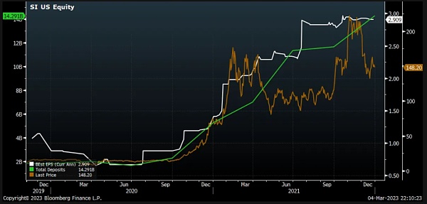Silvergate 在 2019年 IPO 之后,其银行存款翻了整整 7 倍,从 20 亿美元增至 140 亿美元,股价翻了 8 倍,从每股 13 美元飙升至 220 美元。但 SI 股价自 2021 年 11 月达到顶点以来,重挫 97% 跌至 5 美元,面临崩溃破产。