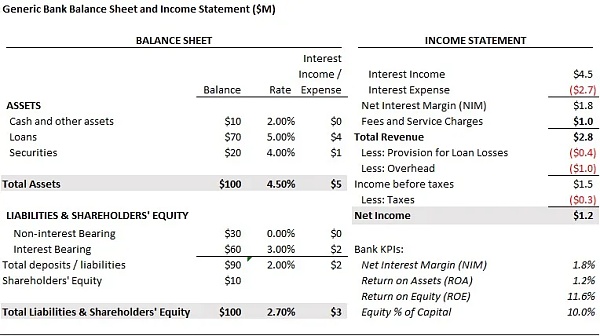 以下是一份简单的资产负债表和损益表,适用 1 亿美元的资产银行。请注意,银行收益的最大驱动力是其存款特许经营权的规模及其净利息收益率 NIM ,其赚钱的利差以资产收益率减去存款成本。