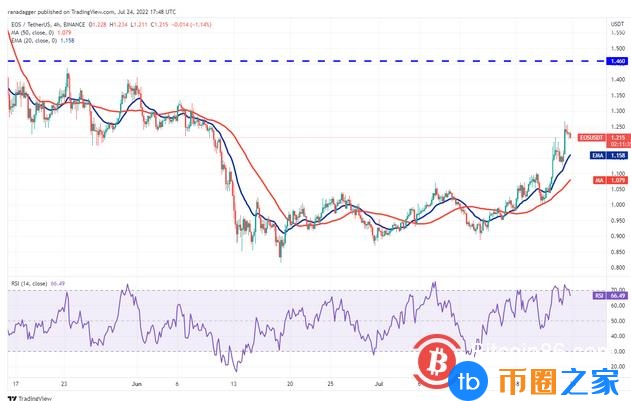 EOS月18日突破均线,7月21日成功重新测试20日均线(1.05美元)。
