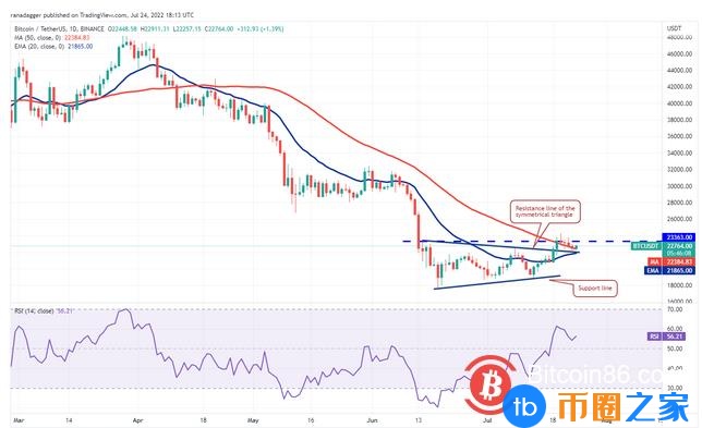 空海德7月23日试图让比特币回归对称三角形,但多头另有打算。从三角形突破水平的反弹表明买方正在积极捍卫这一水平。