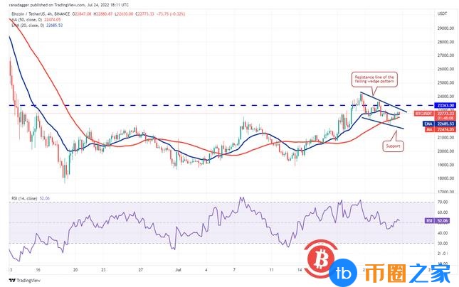如果长期维持价格高于50天简单移动平均线(22.384美元),BTC/usdt货币对可能反弹至23.363美元至24.276美元之间的上方阻力区。突破并收盘于该水平之上可能为反弹至28.171美元的模式目标打开大门,然后上升至30.000美元。
