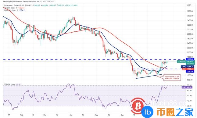 向上的20天移动平均线(1.384美元)和RSI在正区域表明多头占了上风。如果买方将价格推至1.700美元上方,多头动能可能增强,ETH/usdt货币对可能升至2.000美元,然后反弹至2.200美元。
