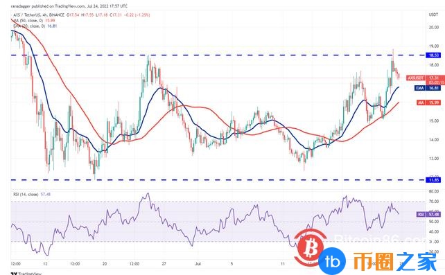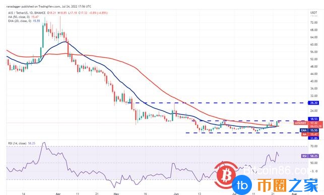 20日均线(15.55美元)趋于持平,RSI处于正区域,表明供需平衡。如果买方将价格推至18.53美元的阻力位上方,这种平衡可能会有利于买方。如果这种情况发生,AXS/usdt货币对可能开始反弹至25.21美元,然后反弹至28.20美元。
