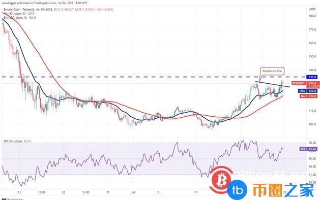 BCH在继续下跌趋势后试图形成底部。价格从7月20日135美元上方的阻力位下跌,但一个积极的迹象是,多头积极捍卫20日均线(117美元)。
