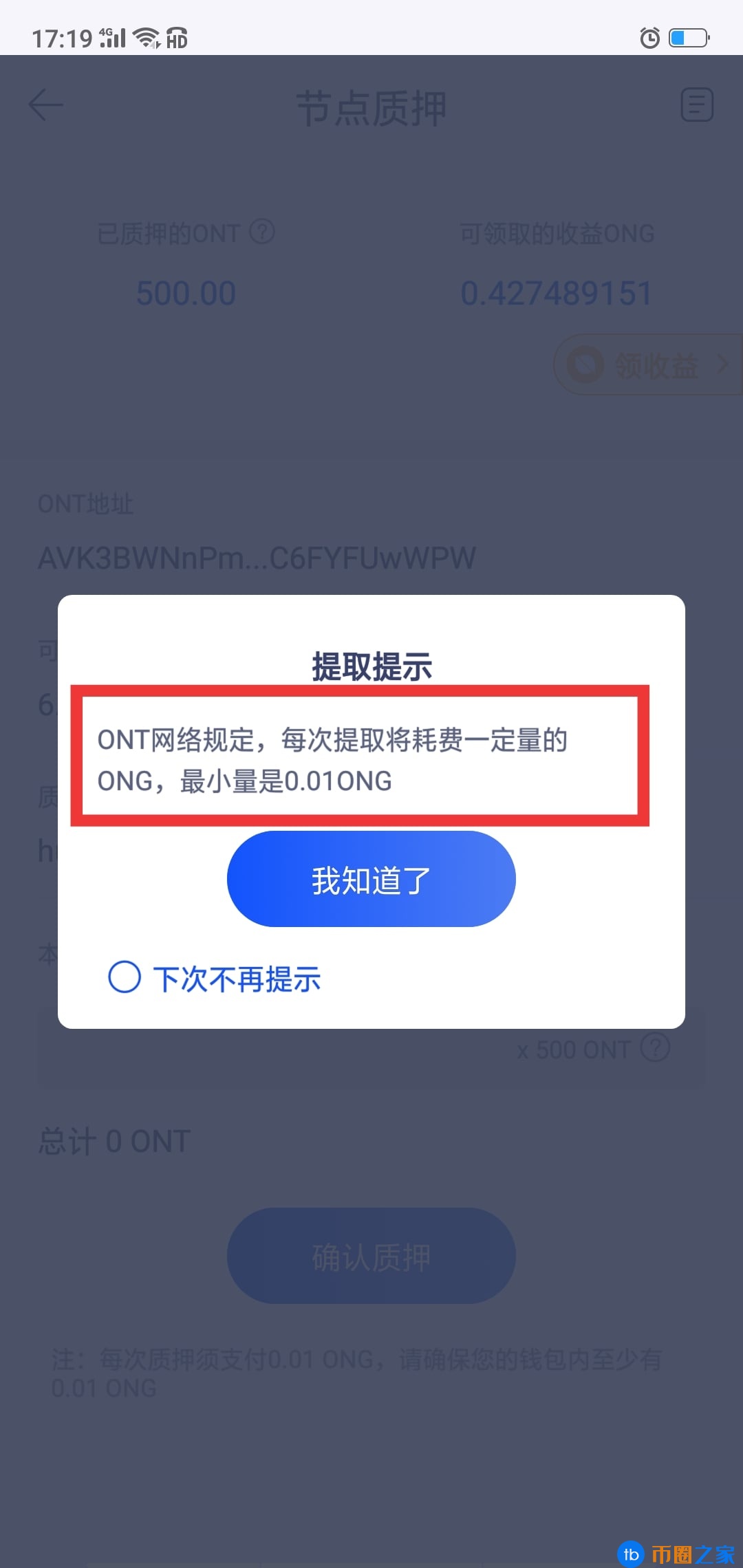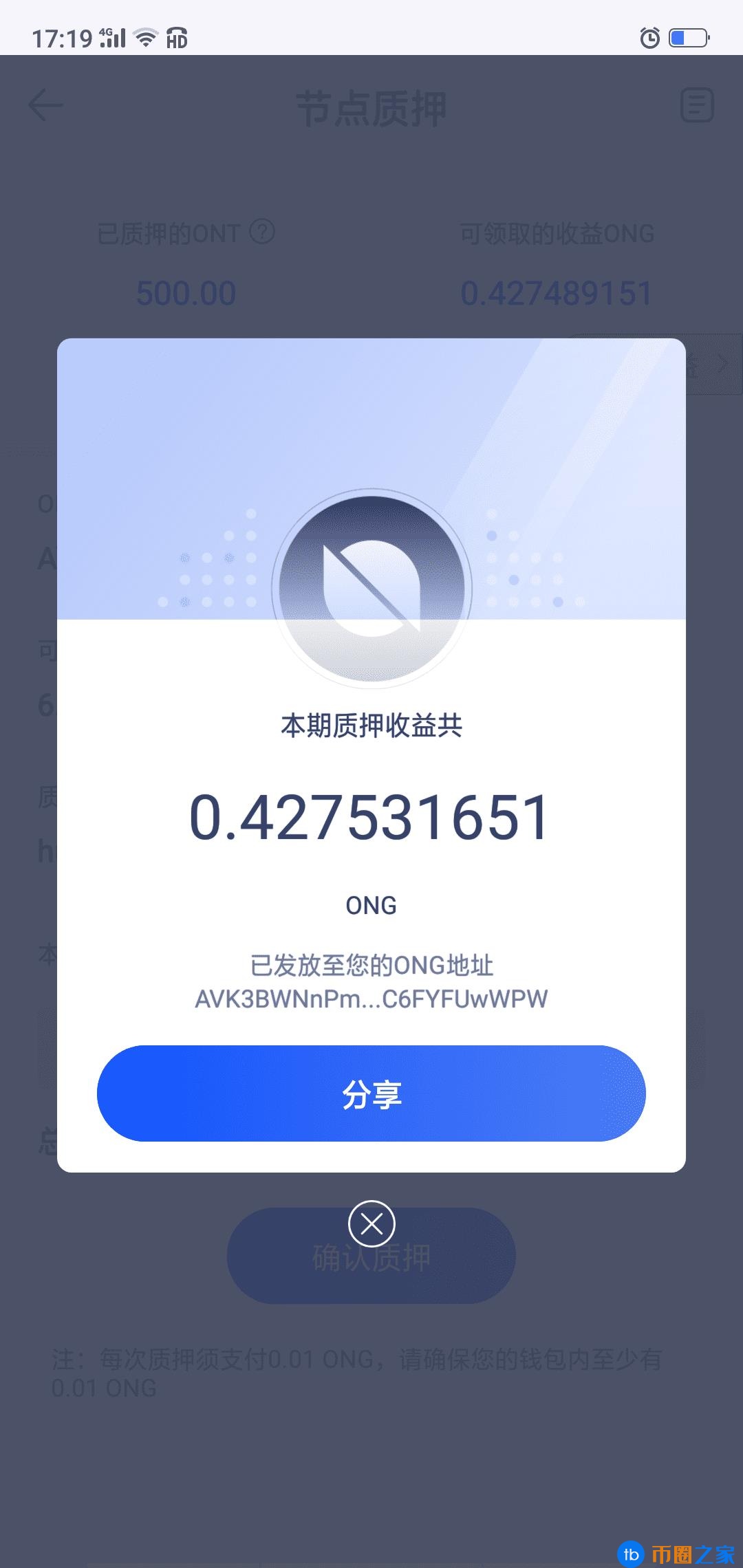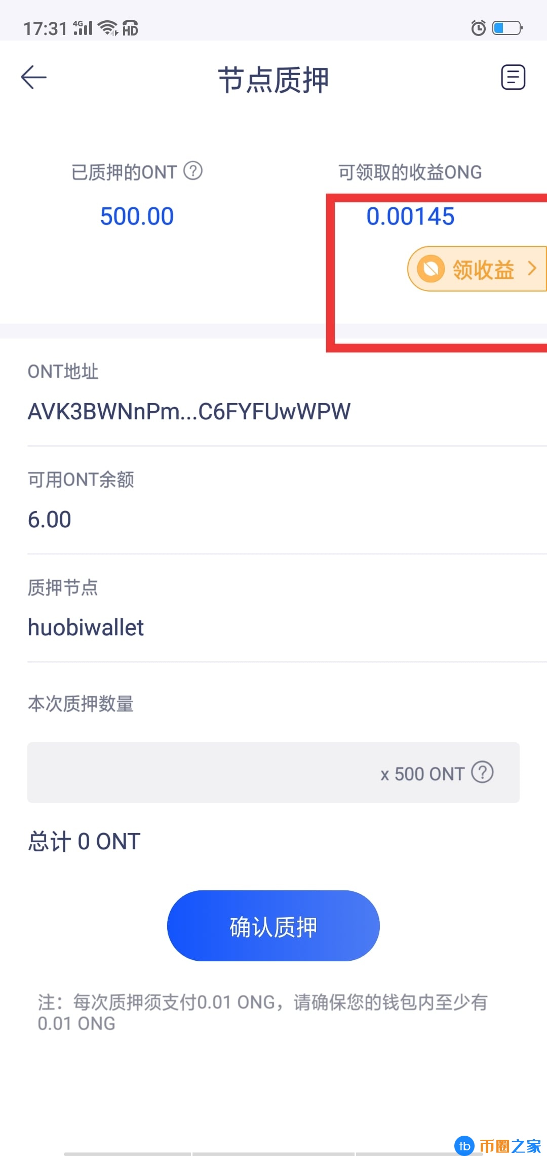 您质押给火币钱包节点后,会在共识周期生效时开始计算收益,而每一轮共识周期结束后,就会收到上一轮共识周期的奖励(当然这中间不得提交赎回)。您只需点击‘领收益’按钮,输入安全密码,并消耗0.01ONG,来提取您的ONG总收益,如下图所示:你质押到火币钱包节点后,共识周期生效时开始计算收益,每个共识周期结束后,会收到上一个共识周期的奖励(当然中途不能提交兑换)。您只需点击’赚取收入’按钮,输入安全密码,花费0.01龙即可提取您的ONG总收入,如下图所示: