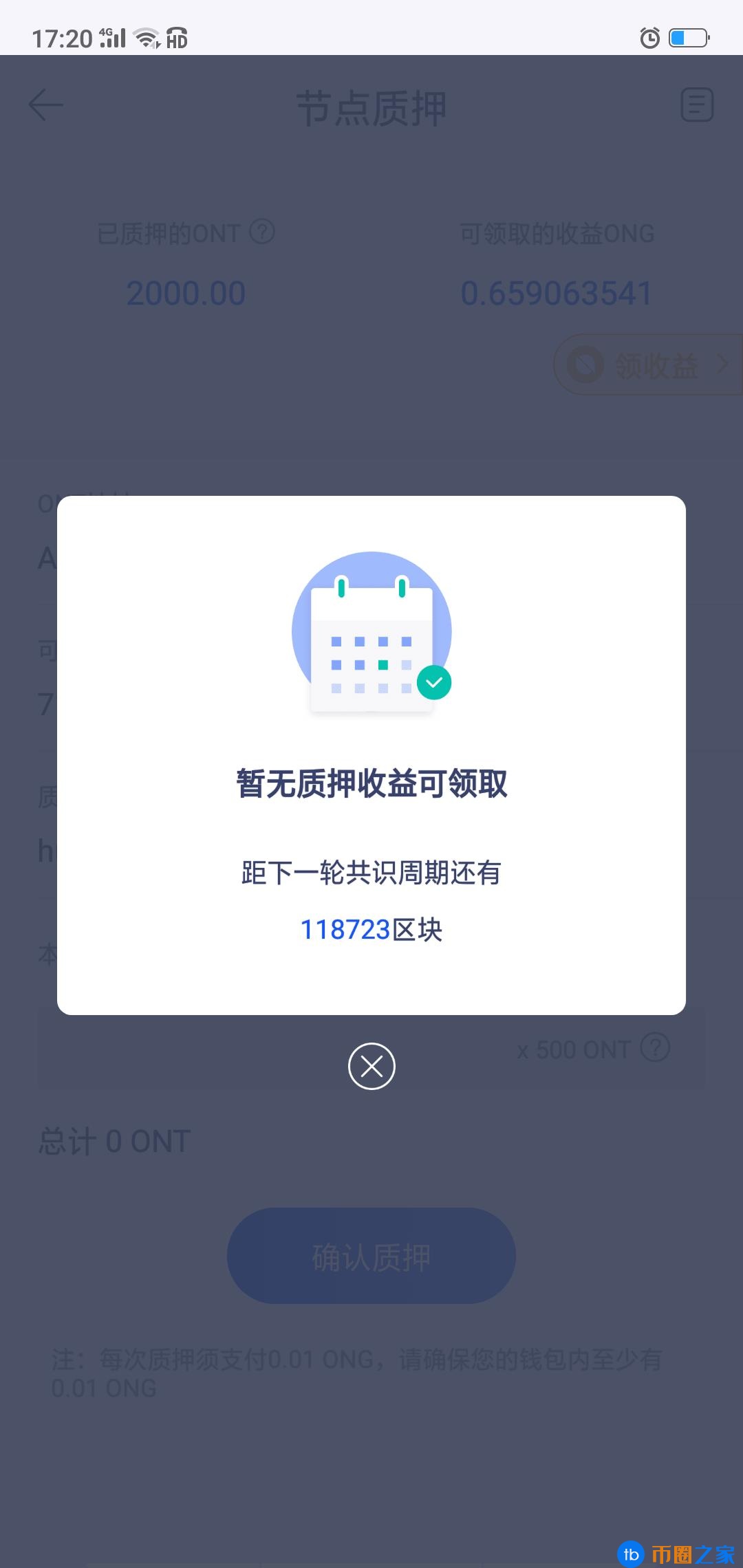 如果没到共识周期结束,那么需要继续等待,您点击领取时,看到的是距离收益还有XXX区块的页面,如下图所示:如果这不是共识周期的结束,那么你需要继续等待。当您点击收集时,您将看到一个页面,其中包含来自收入的XXX块,如下图所示: