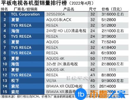 2022年4月,日本电视市场销量第一的电视型号居然来自中国的TCL。2022年4月日本市场最畅销的电视型号来自TCL、夏普和TVS Regza(东芝电视,已被海信收购,运营Regza品牌)。