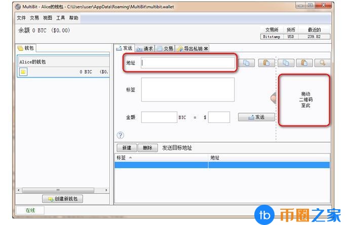 发送比特币:在“发送”标签页,可以输入比特币地址,或者拖动二维码图片到窗框中来快速发送比特币到别人的地址中。发送比特币:在“发送”选项卡上,可以输入比特币地址,也可以将二维码图片拖动到窗框内,快速将比特币发送到别人的地址。