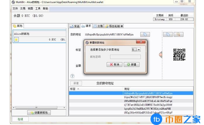 接收比特币:运行多位钱包后,点击“请求”,就会看到你的第一个接收地址(默认为多位)。点击“请求”选项卡上的“新建”按钮,一次创建5个或更多比特币地址,如下图所示: