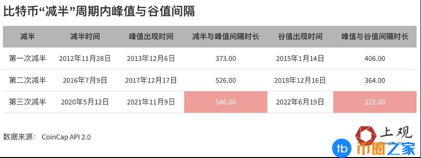 根据数据可以发现,在最近的第三个减半周期中,比特币价格从见顶到“减半事件”的间隔比前两个周期更长(也就是说牛市需要的时间更长),而下跌的速度更快、更急。