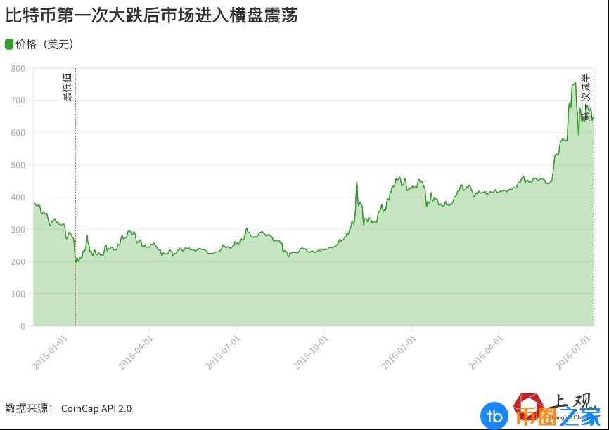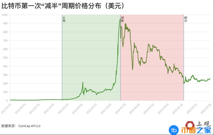 在第一次暴跌的底部,2015年1月14日,比特币跌至197.4美元,与1124.76美元的峰值相比,跌幅超过82%;