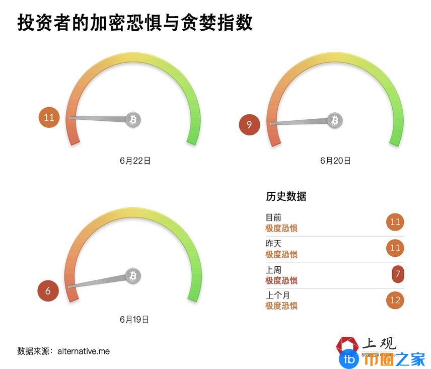随着比特币价格的频繁下跌,加密货币的“恐惧和贪婪指数”也降至低值,最低跌至6,说明投资者已经到了“极度恐惧”的程度。