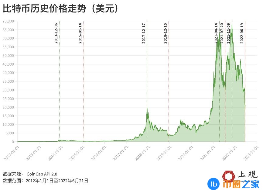 (数据说明:本文中比特币的价格为美元,数据通过开源Api CoinCap2.0采集,数据仅供参考。数据抓取时间为2012年1月1日00: 00至2022年6月20日00: 00,间隔1天。受Api本身限制,丢失了部分数据,但对整体趋势没有影响。)