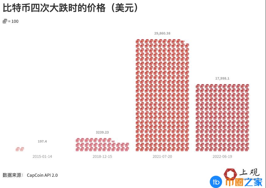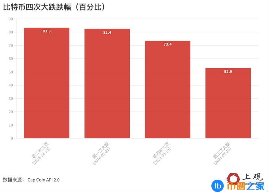 所以,这次下跌并不是史上最大跌幅。降幅最大的发生在2018年。比特币从峰值19339.92美元跌至3239.23美元,跌幅超过83%。