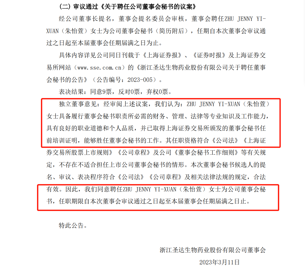 3月11日,圣达生物公告,公司于2023年3月10日召开第四届董事会第二次会议,审议通过了《关于聘任公司董事会秘书的议案》,经公司董事长提名,董事会提名委员会审核,董事会同意聘任ZHU JENNY YI-XUAN(朱怡萱)担任公司董事会秘书,任期自董事会审议通过之日起,至本届董事会任期届满之日为止。