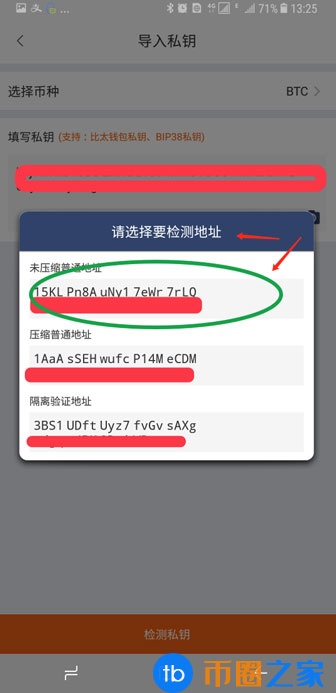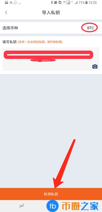 3.选择货币和BTC;在“私钥输入框”中填入备份的BIP38私钥。输入BIP38的私钥后,选择检测私钥。