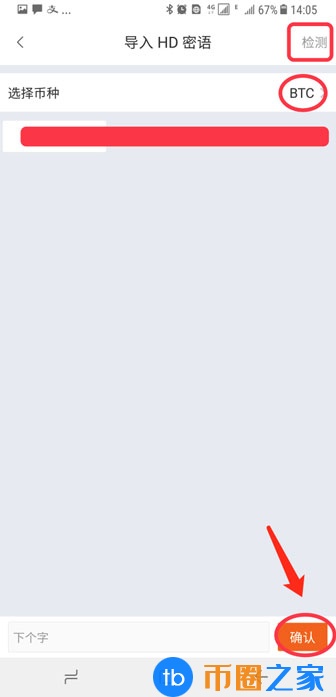 3.选择货币和BTC;输入HD密码。这里导入的高清密码来自Bite的高清密码12个字。也可以用其他钱包的高清密码导入。输入每个单词后,按ok。
