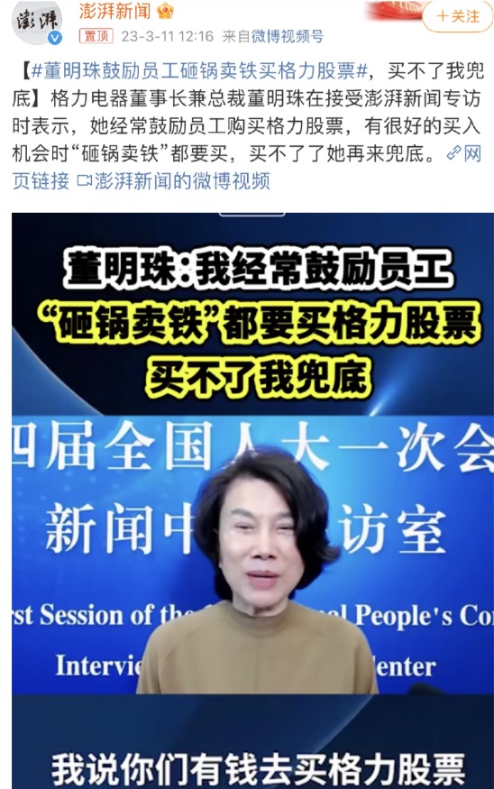 据澎湃新闻专访,董明珠表示,她经常鼓励员工购买格力股票,有很好的买入机会时“砸锅卖铁”都要买,买不了了她再来兜底。